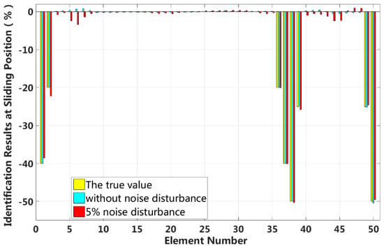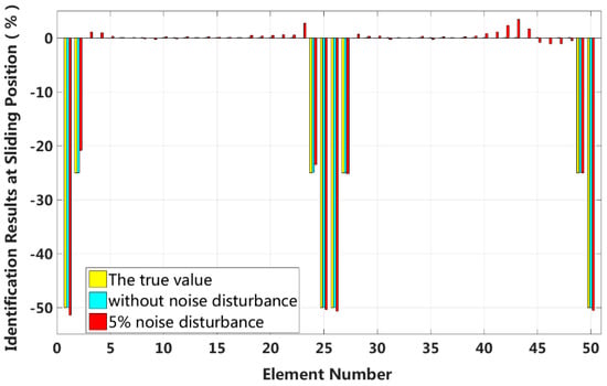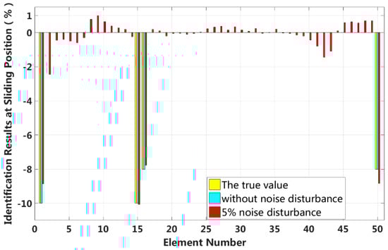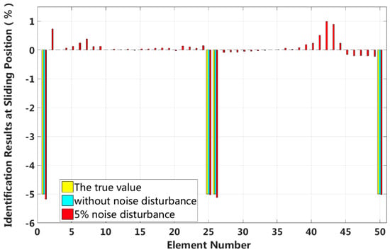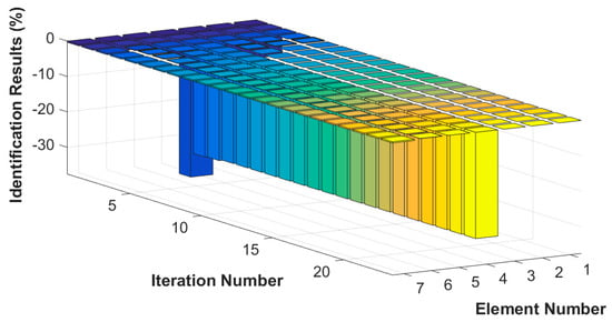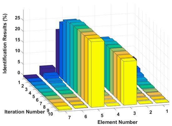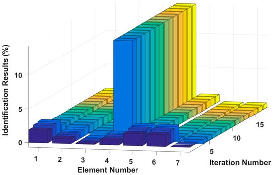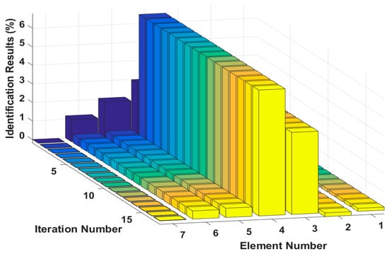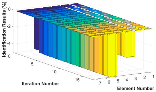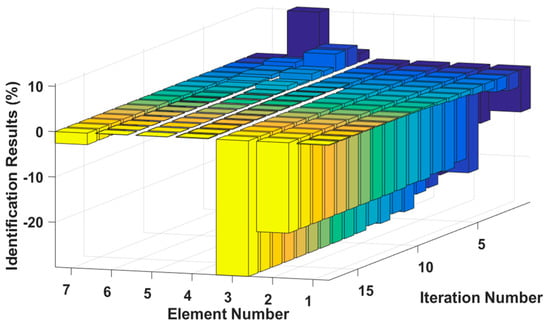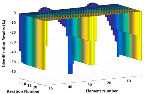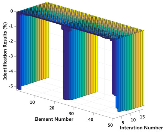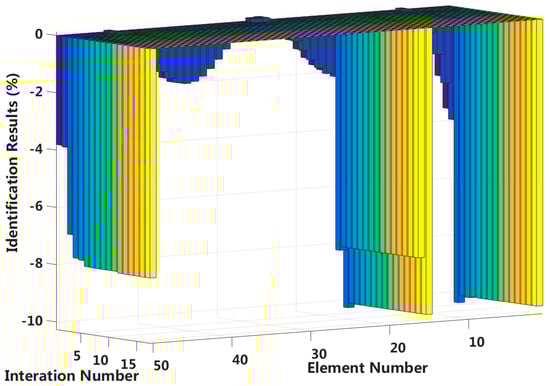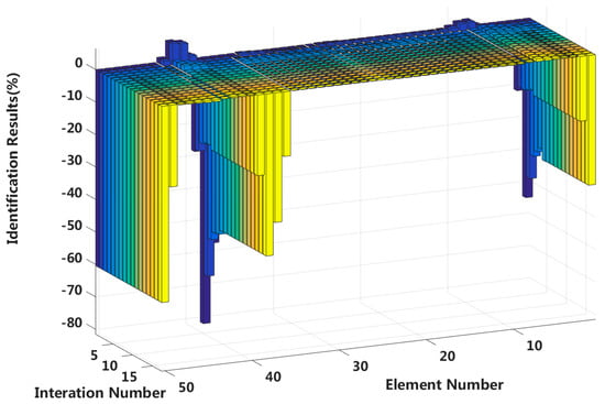 In this case, we assume that a large external load is applied to the 3/4 span of a laminated beam. Extensive interlayer slip damage occurs in eight elements located at both the fixed end and the applied load position. Figure 25 shows the identification results in the asymmetrical damage state, and Figure 26 shows the results of each iteration. In the case of a 5% level of measurement noise, the stiffness changes of the eight interlayer slip damage elements are −38.52%, −22.28%, −20.01%, −40.04%, −50.23%, −25.81%, −24.58 and −49.55%. The stiffness damage identification errors of non-slip elements are less than 3%, and these elements can be easily identified as non-slip elements because the stiffness damage value of the first slip state is not reached.