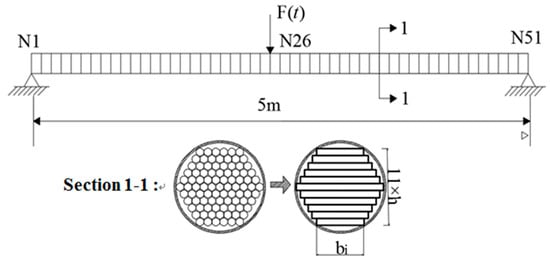 The second example involves a laminated beam model of the PWS-91 parallel cable shown in Figure 18. The length of the cable model is 5 meters, with 50 elements and 51 nodes. The cable is simulated as eleven laminated sections that are 77 millimeters high and 25 to 45 millimeters wide. The physical parameters of the beam model are as follows: mass density ρ = 7.9 × 103 kg/m3 and Young’s modulus E = 195 GPa.