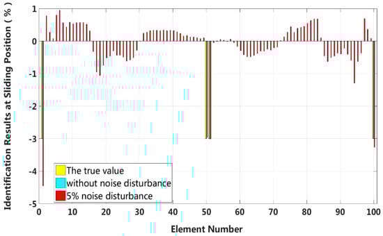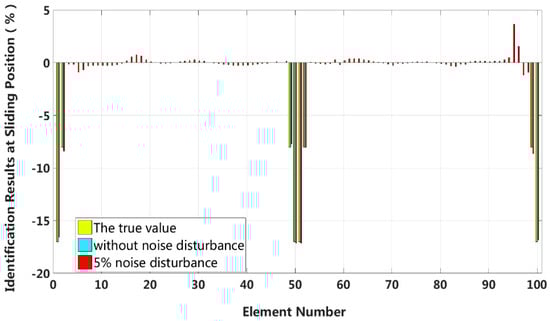 We assume that a small external load is applied at the middle of the laminated beam and that four elements located at both the fixed end and the middle span enter the first interlayer slip damage state. The identification results of interlayer slip damage are shown in Figure 28, and the results of each iteration are shown in Figure 29. In the case of a 5% level of measurement noise, the stiffness values for the interlayer slip damage elements are −4.45%, −2.95%, −3.01% and −3.26%. Additionally, the maximum stiffness damage identification error of non-slip elements is −1.29% in the No.94 element. However, in the case of without noise disturbance, the identification results in all elements are basically the same.