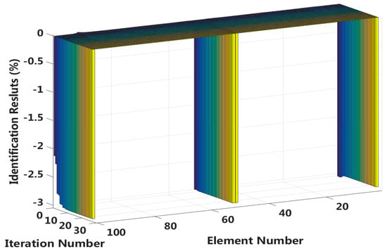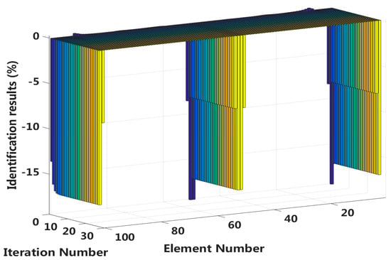 In this case, we assume that a large external load is applied at the middle of the laminated beam. Four elements located at both the fixed end and the middle span are become the full interlayer slip damage state with 17% stiffness reduction, and the four elements next to these elements are in the j-th interlayer slip state with 8% stiffness reduction. The identification results of the interlayer slip damage are shown in Figure 30, and the results for all iteration are shown in Figure 31. In the case of a 5% level of measurement noise, the stiffness changes of the eight interlayer slip damage elements are −16.57%, −8.38%, −7.71%, −17.14%, −17.14%, −8.06%, −8.62% and −16.83%. Additionally, the maximum stiffness damage identification error of the non-slip elements is 3.64% in No.95 element. This level is lower than the stiffness damage value of the first slip state, and such elements can be easily identified as non-slip elements.