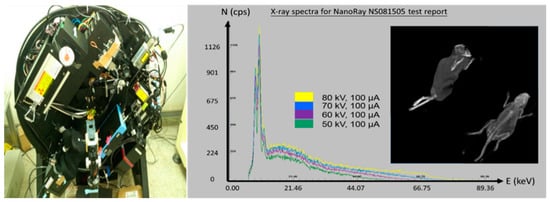 Figure 1 shows the laboratory-designed micro-CT system that provides 50–80 kVp characteristic X-ray beams (NS-081505 X-ray Generator, NanoRay Biotech. Co., Taipei, Taiwan) and its corresponding spectrum, which was measured using a commercial X-ray spectrometer (X-123 Completed Amptek Inc., Bedford, MA, USA) []. Raw projections were acquired from a flat panel detector (864 × 1536 with 75-μm pixel size; Dexela1207, Perkin Elmer Inc., Waltham, MA, USA). The distance from the source to the rotation-center (SOD) of the object is 299 mm and the source to the detector (SID) is 325 mm. The intrinsic field of view (FOV) of each projection is nearly 64.4 mm under this geometric condition. The reconstructed volume (in virtual space) FOV is 59.2 mm × 59.2 mm × 106.2 mm. In real space, the object needs to be smaller than a 25-mm radius cylindrical area to avoid critical component collision and damage during scanning.