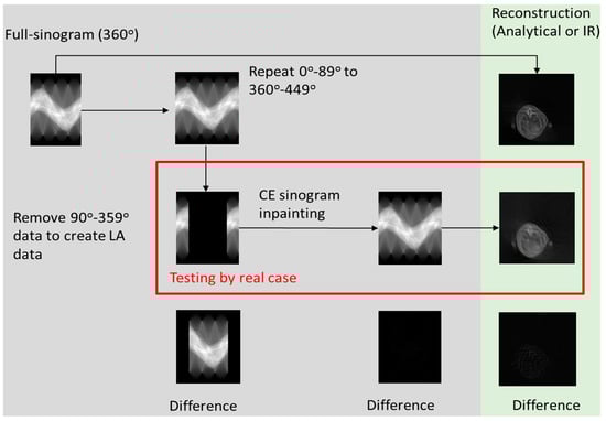 In the simulation, we used a reconstructed CT image and executed a forward projection to create a reference sinogram. The standard sampling rate is 1° within full 360° coverage. Before LAIR reconstruction, we want to recover 90° LA reconstruction by applying CE inpainting. Owing to sinogram repeating after 360°, we copied the first 90° of sinogram information to extend our sinogram to be a 450° covered sinogram as the reference sinogram. The LA sinogram was made using the reference sinogram, which was replaced by 0 during the 90–359° region.