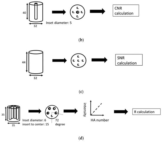The procedure and evaluation method of the test phantom: (a) 25-μm wire phantom, (b) contrast-scale phantom, (c) water phantom and (d) Hydroxyl-apatite (HA) phantom. The dashed-block areas are the regions for calculating the contrast-to-noise ratio (CNR), signal-to-noise ratio (SNR) and linearity. The size of the phantom unit is in mm. R here means the correlation coefficient.