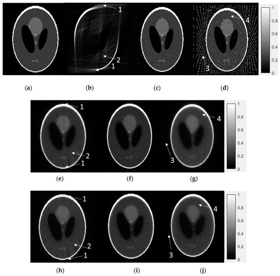 Numerical results for 3D Shepp-Logan phantom: (a) True image. (b) FDK with LA mode (1°/projection with 90° coverage), (c) FDK with DSFC (1°/projection with 360° coverage) mode, (d) FDK with LSFC (5°/projection with 360° coverage) mode. (e) ASD-POCS + CE inpainting + IQ-based stopping criteria for LA mode, (f) DSFC and (g) LSFC mode. (h) EM-TV-based algorithm + CE inpainting + IQ-based stopping criteria for LA, (i) DSFC and (j) LSFC mode. Arrows point to the four types of artifact patterns: (1) unsmoothed shape edge (2) curved-ripple pattern (3) streak-artifact and (4) radiative-pattern.