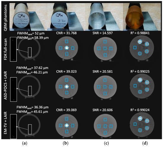 The reconstructed images from the FDK method in DSFC mode and the proposed stopping criteria included in the two LAIR algorithms (ASD-POCS and EM-TV) for four standard physical phantoms including (a) 25-μm wire phantom; (b) contrast-scale phantom; (c) water phantom and (d) HA phantom. The display’s dynamic range was set to the maximum for each different phantom image and the same scale between different algorithms automatically. For details of image analysis, please refer to Figure 4. The standard deviation of the fitted Gaussian function was calculated as 21.739 μm under the geometry of SID of 211.1 mm and SOD of 49 mm conditions to measure the radial spatial resolutions. The 3 × 3 mm2 ROIs were applied to the CNR, SNR and linearity measurements.