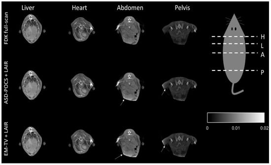 The tomographic images of the contrast-injected mouse, which cross over into the liver (L), heart (H), abdomen (A) and pelvis (P) regions, reconstructed using the conventional FDK and the two LAIR algorithms. The display is in the range of [0, 0.02].