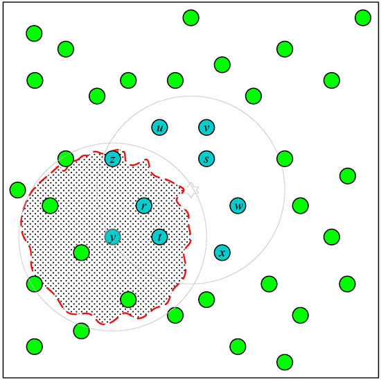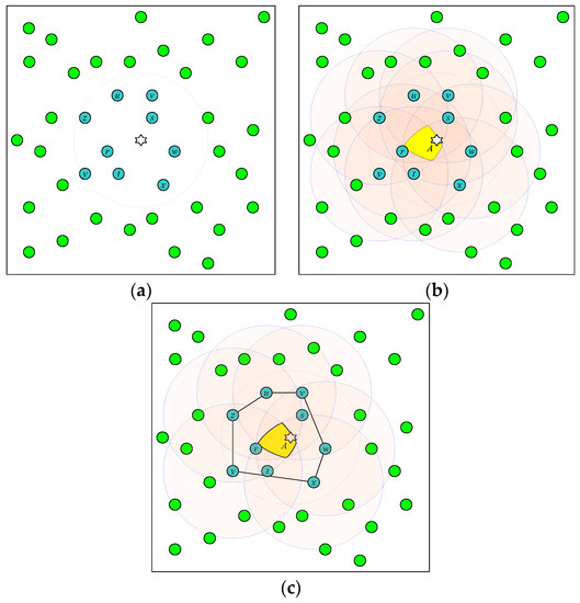 Figure 2 presents a simple example to illustrate this operation. We have sets Ω = {r, s, t, u, v, w, x, y, z} and Ωc = {u, v, w, x, y, z}. The set Ω is employed to compute Tg according to (6). Its location is represented by the circle located in the positioning area shown in Figure 2b. For the sensor nodes in Ωc, their one-hop neighbors are Πu = {a, b, c, d}, Πv = {b, c, d, e, f}, Πw = {f, g, h}, Πx = {h, i, j}, Πy = {k, l, m, n}, and Πz = {a, b, p}. Therefore, Π = {a, b, c, d, e, f, g, h, i, j, k, l, m, n, p}.