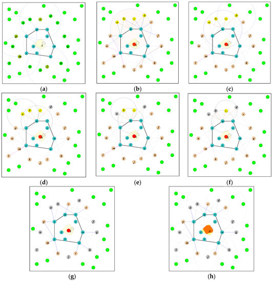 Illustrating the positioning procedure of CAPPS. In this example, Ω = {r, s, t, u, v, w, x, y, z} and Ωc = {u, v, w, x, y, z}. (a) The coverage areas of the non-target-detecting sensor nodes {c, i, m, p} overlap with the positioning area. (b) The sensor nodes in the set Ω are used to compute Tg, illustrated by the circle located at the positioning area. The one-hop neighbors of the sensor node u are identified, and the sorted sequence is stored in the set = {d, a, b, c}. (c) Verify the first sensor nodes d of the set . The sensor node c is enclosed within the intersection area Aud. Thus, the sensor node d is removed from the set . (d–f). Verify the other sensor nodes a, b, and c in the set . (g) The set of remaining sensor nodes for pruning the positioning area Γ = {c, e, i, k, m, p}. (h) The pruned positioning area obtained by applying the sensor nodes in the set Γ.