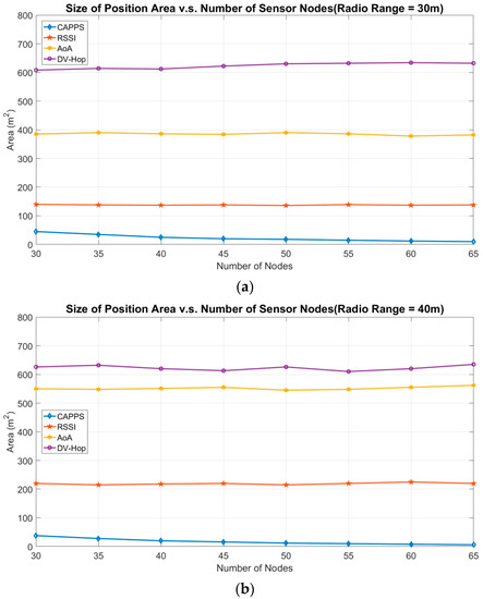 Size of position area vs. number of deployed sensor nodes. (a) The radio range of the sensor nodes in the experiment is set to 30 m. (b) The radio range of the sensor nodes in the experiment is set to 40 m.