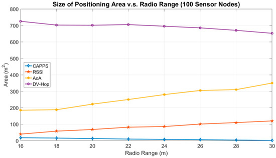 Figure 4 depicts the positioning area sizes for RSSI, AoA, DV-Hop, and CAPPS with different numbers of sensor nodes. In Figure 4a, the radio range of each sensor node is set to 30 m. To display the results clearly, the numerical results depicted in Figure 4a are listed in Table 2. When the number of sensor nodes increases, the size of the positioning area for DV-Hop fluctuates between 608 m2 and 636 m2. Increasing the number of sensor nodes does not explicitly influence the numbers of propagation hops from the target to the anchor points. This is because the sensor nodes are uniformly deployed, and the density of sensor nodes is high enough to cover the entire RoI. The AoA and RSSI methods require a constant number of anchor points to position the target. Thus, increasing the number of sensor nodes does not introduce explicit variation in the positioning area. The size of the positioning area fluctuates within 378–390 m2 and 136–140 m2 respectively for the two methods.
