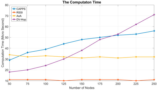 Figure 6 compares the computation times for each method. The radio range in this experiment is 30 m, and the number of deployed sensor nodes ranges from 50 to 250. The platform to perform these methods is equipped with an Intel I7-6700 CPU (3.4 GHz), and the memory is DDR4 2133 8 GB RAM. The graphics card is NVIDIA GeForce GT 430. The simulation results are averaged over 100 different deployment topologies. In this figure, the execution times of the AoA and RSSI methods do not increase when the number of sensor nodes increases. This is because the number of sensor nodes used in computing the positioning area in both methods is constant. The execution times of both DV-Hop and CAPPS increase as the number of sensor nodes increases.