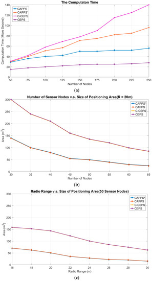 Comparison of CEPS, C-CEPS, CAPPS* and CAPPS. (a) The computation times of the CAPPS, CAPPS*, CEPS, and C-CEPS methods. (b) The impact of the number of deployed sensor nodes on the positioning area. The radio range in this experiment is 20 m. (c) The impact of the radio range on the positioning area. The number of sensor nodes in this experiment is 50.
