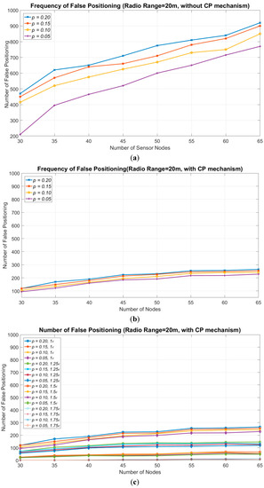 The frequency of false positioning vs. the number of sensor nodes. (a) The frequency of false positioning without applying the CP mechanism. (b) The frequency of false positioning when applying the CP mechanism. (c) The impact of the ε to the frequency of false positioning when applying the CP mechanism. Increasing the ε can lower the frequency of the false positioning.