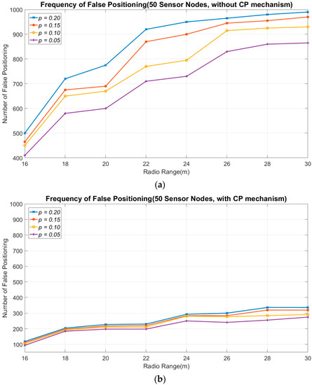 The frequency of false positioning vs. the radio range (p is the degree of signal irregularity). (a) The frequency of false positioning without applying the CP mechanism. (b) The frequency of false positioning when applying the CP mechanism.