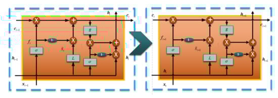 Simple Recurrent Unit (SRU) is the recently proposed variant of RNN, and the SRU has a more concise structure for accelerating the training procedure [39]. When compared with other RNN variants, for instance, Long Short Term Unit (LSTM) and Grated Recurrent Unit (GRU), the SRU has faster training speed that is brought by its unique structure [39,40]. Figure 1 shows the basic architecture of the employed SRU, and it is constructed based on the “gate” structure, which also is composed of LSTM and GRU. In a single layer SRU illustrated as Figure 1, it is usually has two essential components, which are termed as “light recurrence” and “high network”. The light recurrence component reads the input vector and calculates the sequence of the state . This module captures the sequential information [39,40]. The light recurrent procedure can be summarized as the following Equations (1)–(3):