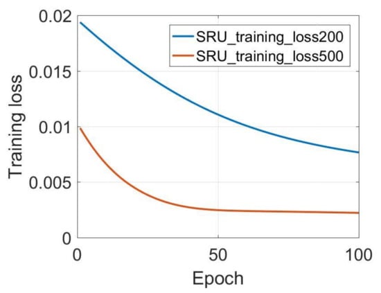 Table 3 lists the prediction results of different training data length for the three-axis gyroscope, while the input data size and testing data size are fixed. The training data size varies from 200 to 10,000. For the X-axis gyroscope, the standard deviation (STD) values varying from 0.054 to 0.062 with the software running time varies from 57.8 s to 77.97 s. Figure 6 shows the SRU-RNN training loss comparison between data length of 200 and 500. The blue line represents the SRU training loss, with 200 training data length. The red line represents the SRU-RNN training loss with 500 training data length. From the Figure 6, it can be seen that SRU with a training date length of 200 does not converge within the set epoch of 100. However, with the 500 input data length for training, the SRU-RNN is able to converge within 100 training epoch.