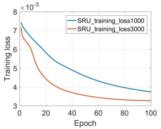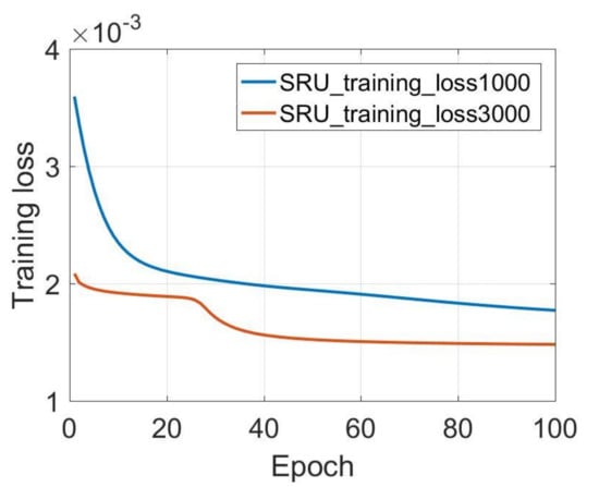 In addition, the Y-axis and Z-axis gyroscopes results are also listed in Table 3. Similarly, the SRU-RNN is unable to converge when the data length is not sufficient with the 100 training epoch. Figure 7 and Figure 8 show the training loss comparisons. It can be seen that SRU-RNN with 3000 training data length converge, while the SRU-RNN with 1000 training data length is unable to converge within the set training epoch values. In theory, more training data will lead to slower convergence speed. However, from the results, the SRU-RNN with more training data converges faster. SRU-RNN is a deep recurrent neural network depending on the memory. Under this condition, while the training data is of small length, it is not sufficient for this SRU-RNN training and learning of the model. Thus, the SRU-RNN is able to converge with sufficient training data length. In aspects of the standard deviation (STD) of the de-noised testing data, the STD values keeps almost the same, which might demonstrate that the SRU-RNN has been well trained. Therefore, for the X-axis gyroscope (Figure 6), 500 is sufficient, however, for Y-axis and Z-axis gyroscopes (Figure 7 and Figure 8), 3000 is sufficient. The difference between the three gyroscopes might be caused by the MEMS manufacturing technology, which leads to the difference in the three-axis gyroscopes signals characteristics.
