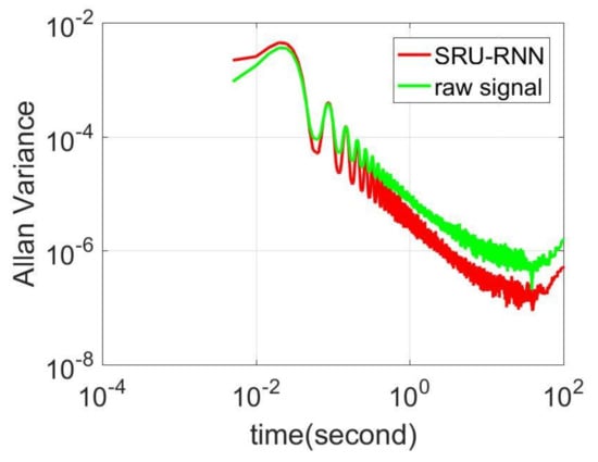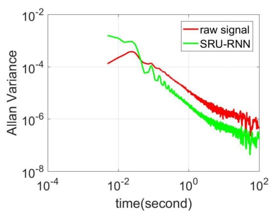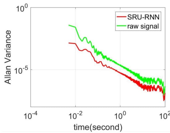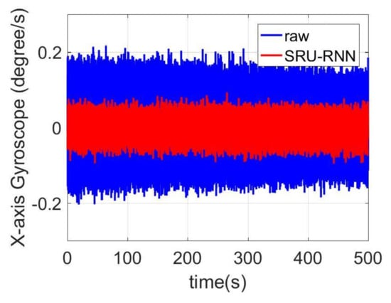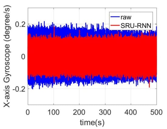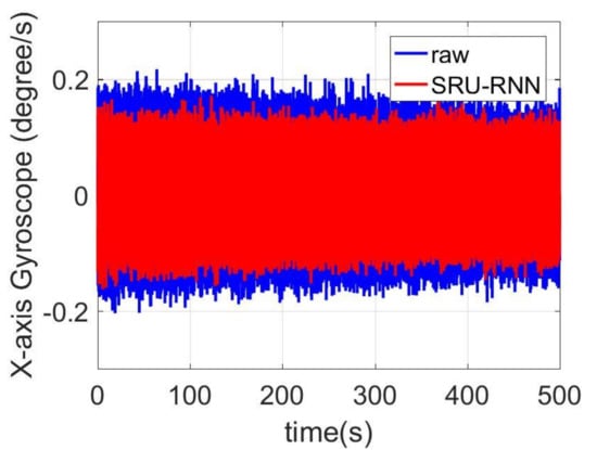 In Section 3.1, the influence of the training data length on the training or prediction results were analyzed. As aforementioned in the introduction section, quantization noise, angle random walk, and bias instability are the major index for describing the MEMS IMU performance. Thus, Figure 9, Figure 10 and Figure 11 shows the comparison of the de-noised and raw signals, Figure 12, Figure 13 and Figure 14 presented the Allan Variance comparison results, and Table 4, Table 5 and Table 6 show the comparison of the parameters between raw signals and de-noised signals. For the X-gyroscope, the quantization noise has a minor improvement, while the angle random walk and bias instability have a 6.8% and 12.5% improvement, respectively. The Y-axis gyroscope has a 60.5% improvement in quantization parameters and 17.3% and 34.1% in angle random work and bias instability, respectively. The rest Z-axis gyroscope has an improvement of 11.3%, 22.7%, and 35.7% in parameters of quantization noise, angle random walk, and bias instability individually. The attitude errors are listed in Table 7, the roll, pitch, and yaw angles errors decreased by 19.2%, 82.1%, and 69.4% individually. In this experiment, the X-axis gyroscope measured the pitch angle, the Y-axis gyroscope measures the roll angle, and the Z-axis gyroscope measures the yaw angles. These attitude angles were calculated based on the quaternion algorithms, and more detailed could be found in the reference [42]. Since the IMU was placed statically in a table, the initial values were all set to zero.