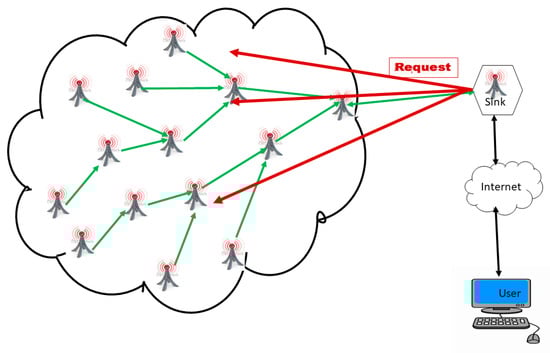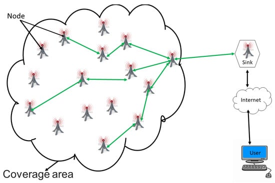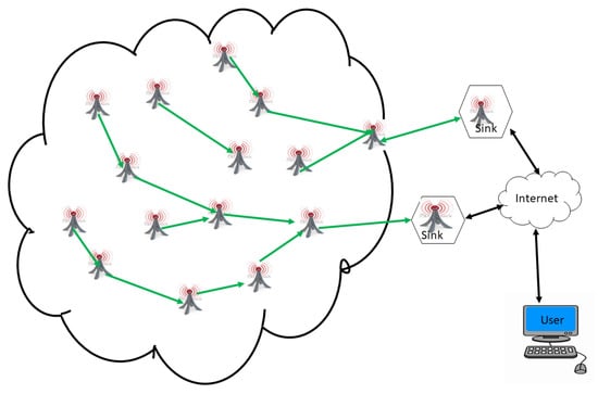 A WSN is an ad hoc network consisting of a set of sensor nodes, randomly fixed or dispersed in a given geographical area, communicating via a wireless link to autonomously collect, process, and transmit data in their environment to a special node, considered the collection point, called a sink [16,22,30,31,32]. The geographical area where the sensor nodes operate is called the field or area of interest. In a WSN, sensor nodes are able to self-organize to collect information about the environment where they are deployed. The transmission of the collected data can be done periodically or event-based, depending on the nature of the implemented application. The sink is a node with two or more network interfaces that act as a bridge between the WSN and the end-user’s network (for example, a local area network or the Internet). The user can send requests to other nodes in the network via the sink, for example, to specify the type of data to be collected. For illustration purposes, Figure 1 shows the basic architecture of a WSN. The sensor nodes randomly deployed in a zone of interest and the sink located at the end of the zone are responsible for recovering the data collected by the sensors. Most often, the sink collects and processes network data, thus sending only relevant information to the user. It can also receive commands to run on the internal network from it (the user). The collected data are processed and analyzed by the user.