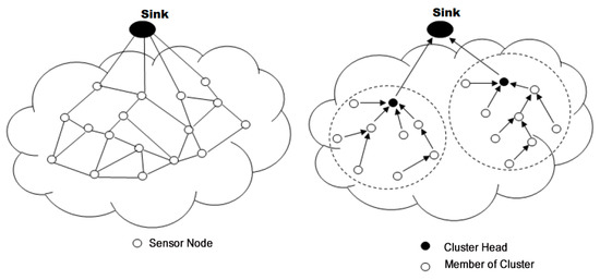 Using multihop communication reduces transmission distance, thus reducing energy loss in order to increase the service life of the network. In multihop transmissions, network architecture plays a major role. Multihop network architectures are typically divided into flat or hierarchical architectures. Figure 5 illustrates this type of communication.