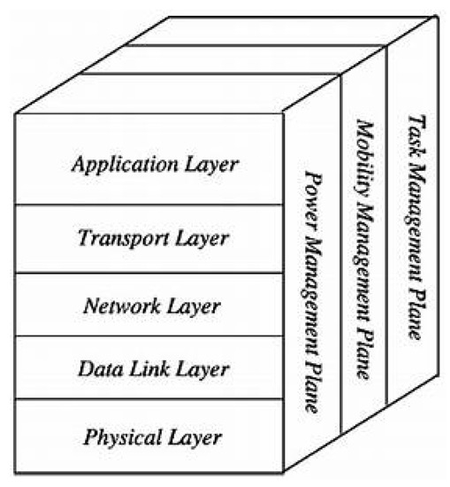 The role of the protocol architecture given in Figure 6 is to standardize communication between network components so that different vendors can develop compatible products (software or hardware). This protocol stack combines energy routing and management, and integrates the data with the network. It communicates efficiently (in terms of energy) through the wireless medium and promotes co-operative efforts among sensor nodes [45]. Depending on detection tasks, different types of application software can be designed and used in the transport layer. A WSN can be seen as a series of connections between sensors that enable them to communicate. The content, scope, size, speed, and connectivity of the network depend on the set of protocols and their implementation. This includes application, transport, network, link, and physical layers, and energy-, mobility-, and task-management plans.