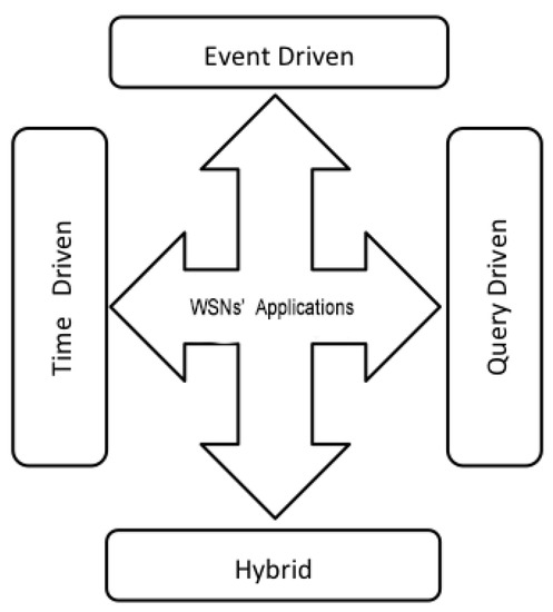 In this category, applications aim to periodically evaluate the measurements of the given physical quantities. Note, for example, the application of WSNs in the monitoring of the atmospheric pressure of a large area or variations in ground temperature at a small volcanic site [47]. These applications react in a given period sink. The sensors take a sample of the environment and transmit it by means of an appropriate communication protocol to the final sink. For the smooth operation of these applications, with better quality of service, it is important: that the sampling frequency is sink-chosen, that the connectivity of the network is kept under control, and to have communication protocols adapted to that kind of data. The sensor nodes used in this type of application can sleep, i.e., turn off their radio during periods of inactivity in order to manage the energy consumption of the network.