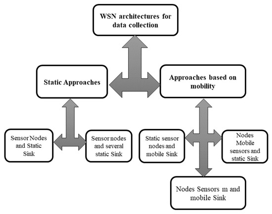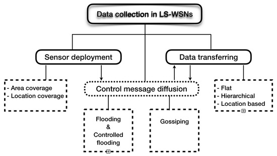 A number of studies that provide a background to WSNs and Big Data on the one hand, and overviews of data-collection schemes in the context of LS-WSNs on the other, have been proposed in the recent literature. We reviewed most of the latest existing papers related with the topics examined in this paper. In this light, Rawat et al. (2014) [22] proposed a review of recent developments in WSNs by surveying the leading research projects, platforms, standards, and technologies related with sensor networks. Bouaziz et al. (2016) [23] as well as Sanchez et al. (2018) [24] have reviewed recent trends of mobility management in WSNs while highlighting applications and platforms. Di Francesco et al. (2011) [25] provided an extensive survey and taxonomy of the data-collection process with mobile elements in WSNs. In addition to sensors, there has been a recent tendency to use unmanned aerial vehicles like drones for data acquisition. In this context, swarm intelligence schemes based on bacterial foraging optimization have been successfully used to collect massive data in LS-WSNs [26,27].