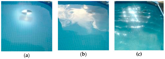 Camera and lamp are above the water: (a) dusk, calm weather; (b) daylight, calm weather; (c) daylight, windy weather.