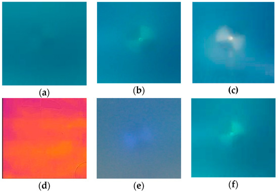 Secchi disk at 1.0 m distance: (a) passive imaging; (b) active imaging (1200 Lm); (c) active imaging (5000 Lm); (d) infrared imaging; (e) ultraviolet imaging; (f) polarized light.