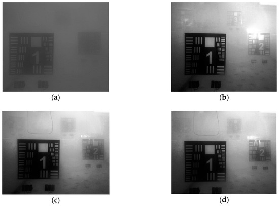 The color filters were attached to a flashlight: red (680 nm), orange (610 nm), yellow (580 nm), green (530 nm), and blue (470 nm). Figure 6 shows photographs taken using these filters. For a more accurate comparison, we converted these images into monochromatic shades of grey. The resolution test charts were placed at 0.5 m, 1.0 m, 1.5 m, and 2.0 m distances. Measurements were made on a bright, sunny day, but the water tank was in a shadow. As seen in Figure 6a, with passive measurement, the elements of the target 2 (1.0 m) are indistinguishable. When using a powerful torch (Figure 6b), the elements of target 3 (1.5 m) become readable. Target 4 at 2.0 m distance was almost invisible in all cases.