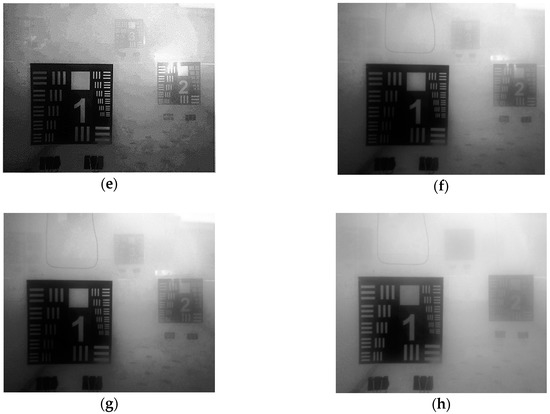 Resolution test charts: (a) passive imaging, (b–g) active imaging with 5000 Lm lamp: (b) white light (no filter), (c) red, (d) orange, (e) yellow, (f) green and (g) blue color filters; (h) ultraviolet lamp.