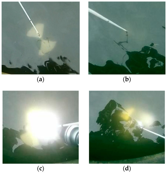 In an image taken of an underwater target from above the surface of a body of water, the most common forms of distortion are caused by reflections of light off the surface of the body of water, which can obscure a target object or appear as a second object in a target detection, refraction resulting in a geometric deformation of the target and thus resulting in the loss of shape and causing the possibility of not being able identify or misidentifying a target object and also change in apparent position due to the change in refractive index of air and water. Indeed, the experiment showed that in bright sunlight underwater objects were difficult to see due to the mirror effect and during windy weather the objects were indistinguishable in rough water (Figure 4).