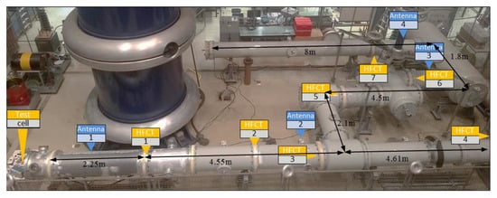 The experiments reported in this paper were conducted on a 380 kV, SF6, actual-size, GIS available at the High Voltage Laboratory of TU Delft, see Figure 1. This GIS spans over an area of approximately 11 × 6 m and it includes spacers, T-joints, earth switch, switchgear, bushing and a disconnector. The labels correspond to seven of the spacers where HFCT sensors were installed. The location of the UHF antennas is also indicated.