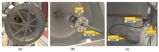 Gas insulated system (GIS) end, (a) ground electrode; (b) positioning of the test cell and sensor; (c) positioning of pulse calibrator.