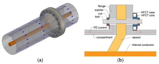 In Figure 3a, a spacer is placed in between two compartments. The PD pulse current flows along the compartments and bridges the spacer via the bolts as depicted in Figure 3b, which connect adjacent compartments [9]. Figure 3b shows that the bolts are not in electrical contact with the flange of the compartments, therefore the current flows along the bolts. An HFCT properly installed at one of the bolts of the spacer picks up the magnetic field produced by the PD currents. The HFCT measures a portion of the PD currents since they split over the total amount of bolts. The washers and nuts act like bridges closing the path between the bolts and the compartments.