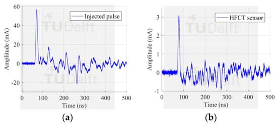 Results with configuration 1, (a) pulse injected at the test cell position; (b) pulse measured by HFCT 1. Only one sensor installed and 15 parallel current paths.
