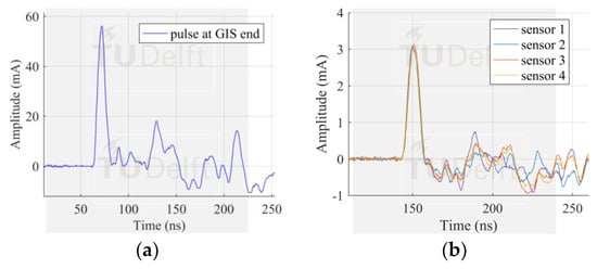 The similarity in pulse shape and peak amplitude of the measured pulses, showed in Figure 6b, proved that the pulse current flows homogenously along the GIS compartment perimeter. Moreover, the ratio of the peak amplitudes was 5.51%, similar to that achieved by configuration 1.