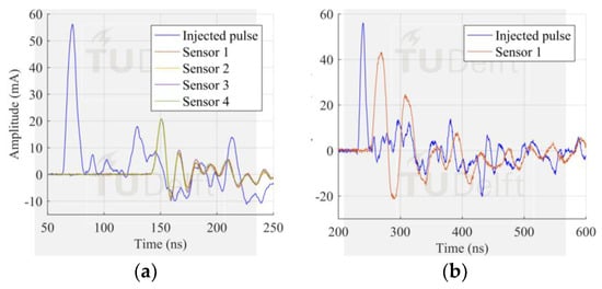 Results with configuration 3, pulse injected at the test cell position (a) four sensors installed and no current flowing through the remaining 12 bolts; (b) one sensor installed and no current flowing through the remaining 15 bolts.