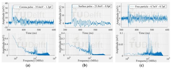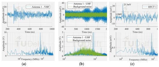 Smallest free moving particle signal measured by (a) antenna 1 in VHF; (b) antenna 1 in UHF; (c) HFCT 1.