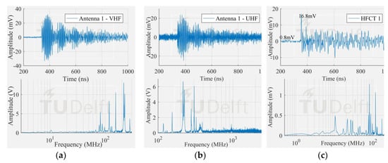 The sensitivity attainable by the measuring system in configuration 1 was determined by its ability to pick up the signals corresponding to the PD tests reported in the previous section (Figure 8). The smallest and the largest signal from each PD test were chosen as case of study. The measured signal by the antenna 1 and HFCT 1 were compared for the case of the smallest signals from each PD tests. The largest signals were used to verify the sensitivity of the HFCT sensors at different locations. In addition, to contrast the performance of the system, the results were compared to the results of a VHF/UHF measurement. Details of the VHF/UHF sensors can be found in [14]. Different amplification ratios were necessary in each test. Table 1 reports the testing parameters and specifications of amplifiers and sensors.