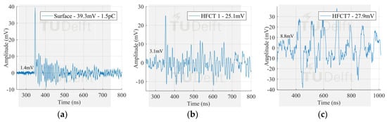 The signals measured by the HFCT sensors corresponding to the largest PD discharges in Figure 8 can be seen in Figure 13, Figure 14 and Figure 15. In this case study, the signal measured by HFCT 7, located at the opposite end of the GIS (16 m away from the test cell) is also reported. Before reaching the HFCT 7, the induced PD currents passed over the several components of the GIS that distorted the signals. However, the amplitude is reduced in a much less extend as evidenced by the low background noise. On the other hand, fewer GIS components between the PD source and the HFCT sensor results in a lower pulse distortion as can be observed by the results of HFCT 1.