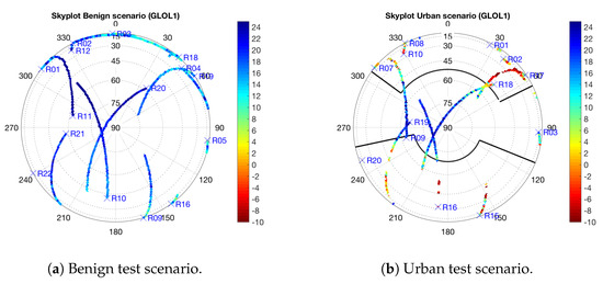 - Benign: Static recording at the open sky scenario shown in Figure 5a. The antenna was placed on a tripod on a farmer’s field with dry soil and no objects anywhere nearby. This test is attempted to minimize multipath and to be the reference file for calibration purposes.