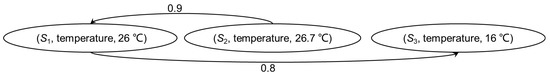Some relative quality constraints can be used to infer the relative quality of the observations. For example, if we know that the temperature sensor used by Source 2 possibly be a newer model of the sensor of Source 1, we can infer that the value of temperature provided by Source 2 tends to be more accurate than Source 1. Arcs with probability can represent the existence of relative quality constraints. In Figure 1, the arc from (temperature, 26.7 °C) to (temperature, 26 °C indicates that there may exist a relative quality constraint that “the sensor of Source 2 provides higher quality temperature than the sensor of Source 1”, and the probability of the existence of the constraint is 0.9.