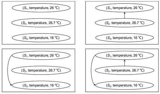 In the definition, means that is not defined at . Figure 2 is the quality graph of the object “temperature” in Figure 1. For the arcs in , the semantic of the arc weight is the probability of the arc’s existence. For example, if the weight of an arc a is 0.9, the probability of a’s existence is 0.9, and the probability of non-existence is . Therefore, possible worlds [45] can be used to describe different situations of data quality. Figure 3 shows the the four possible worlds corresponding to Figure 2, and the probabilities of each possible worldc are 0.02, 0.18, 0.08, and 0.72, respectively.