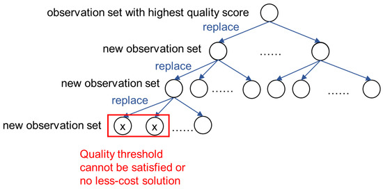 The main idea is that we first find the observation set with highest quality score, then we continually replace one observation in current set by an unused observation of the same object with a lower or equal quality score, to see if the new set after replacement can satisfy the quality threshold at a lower cost. The replacement step is repeated until the quality threshold cannot be satisfied or there is no less-cost solution.