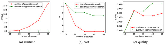 Quality. The quality of the optimal solution returned by accurate search is usually closer to the quality threshold and therefore lower than the quality of the result of the approximate search. Please note that when the data source is 10, there is no result that satisfies the quality threshold. To comprehensively compare the two methods, when implementing the two methods, we require that both methods return the highest quality result in this case. At this time, the results of the two methods are the same, and the quality score is 0.945.