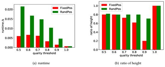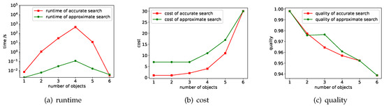 Quallity. As increases, the quality of the results decreases. Accurate search sacrifices quality to reduce costs while ensuring that the quality threshold is satisfied, so sometimes the resulting quality scores are lower than the approximate search. For example, in the case of or , accurate search can find the solution that with lowest cost, but the quality is also lower than the solution returned by approximate search.