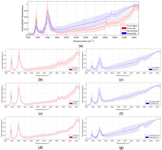 Average and standard deviation of the pre-processed spectroscopic signatures. (a) Tumor vs. normal samples; (b–d) Grade IV, III, and II tumor samples, respectively; (e–g) Mixed, grey matter, and white matter normal samples, respectively.