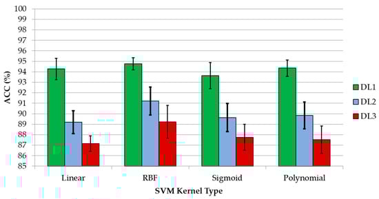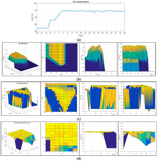 Due to the presence of parameters in the SVM configuration that can be adjusted in order to obtain the optimal performance in the classification results, an exhaustive analysis of these parameter values were performed for each discrimination level of the entire dataset (DL1, DL2, and DL3). To optimize the values of the parameters for each kernel, a repeated cross-validation was performed. The parameters were modified with a certain step between the limits presented in Table 3 for each DL and type of kernel. These limits were determined empirically after several analyses of the parameter limits, performing a coarse grid search, in which the average ACC values of the cross-validation process were inspected. Figure 3 shows an example of the grid search performed for DL1 per each type of kernel. The grid search of the linear kernel shows the ACC results versus the logarithmic values of parameter C (Figure 3a). Figure 3b shows the RBF kernel grid search where the representation of the parameters C versus γ show the ACC value for each C − γ pair. In case of a sigmoid kernel, parameter C is fixed with the previously calculated value in the RBF grid search, and the best pair of γ − cf parameters was identified (Figure 3c). Finally, in the polynomial kernel, the parameter C was fixed with the previously optimized value obtained in the RBF kernel grid search, and each γ − cf pair was computed for each d value. At that point, the best three parameters (γ, cf, and d) that optimize the ACC result were searched. Figure 3d shows the grid search that was performed to find of the best pair of γ − cf parameters for a certain degree value (d = 8 in this case). The grid search was performed in two steps. First, a coarse grid search was performed, and then, a fine grid search was done in order to find the more accurate optimal parameters. In Figure 4, a graphical representation of the average values of the ACC results that were obtained with each fine-tuned kernel for each discrimination level is presented. As it can be seen, the RBF kernel is the one that offers the best results.