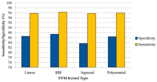 However, computing the sensitivity and specificity metrics is also required in order to validate whether the RBF kernel is the one that offers the best tradeoff between sensitivity and specificity. To compute this using the optimal parameters identified for each kernel, a classification of each discrimination level was performed to obtain the sensitivity and specificity values. The classification was performed employing the one-versus-all method, where the metric values for a certain class are calculated, taking into account the remaining classes as one single class [28,29].